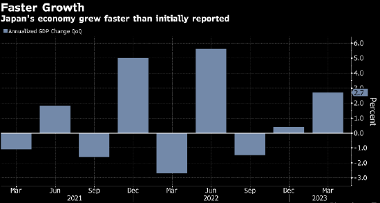 随着企业增加支出,日本第一季度GDP终值显示经济增速比最初估计地更快。日本政府周四公布的数据显示,第一季度GDP环比折合年率增长 2.7%,超过1.6%的初值,也高于经济学家的预估中值1.9%。