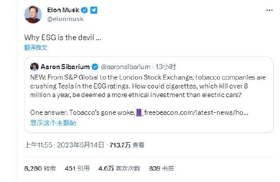 马斯克对这条推文进行了回应,他写道:“为什么ESG是魔鬼……”,意思是说这篇文章清楚说明了为什么ESG评级不可理喻。