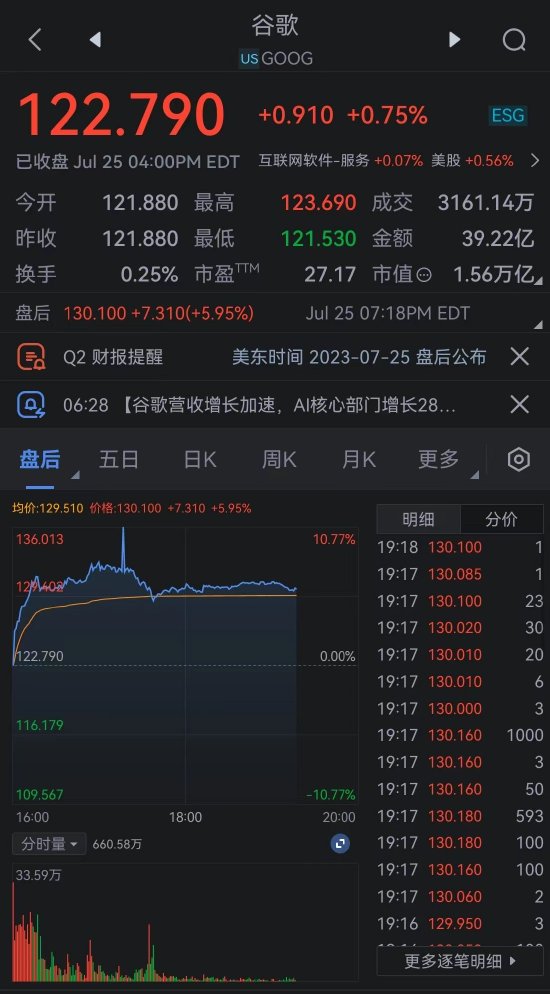今日Alphabet发布二季度财报,整体、云业务、YouTube营收均超预期,盘后股价大涨,现涨近6%。