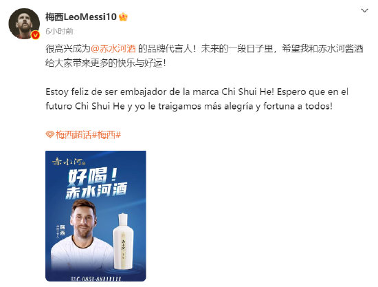 8月1日,阿根廷足球运动员梅西通过其个人微博宣布,其成为赤水河酒的品牌代言人。