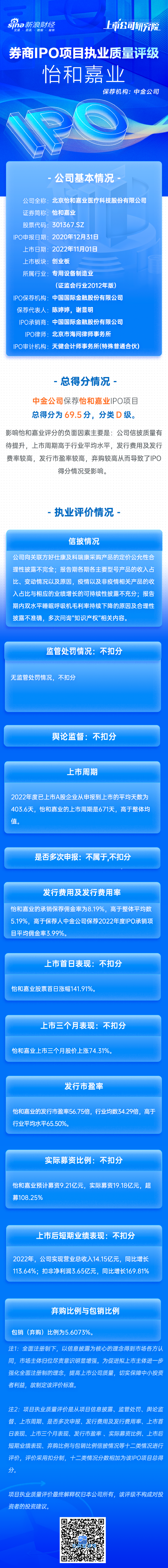 IPO项目总得分69.5分,分类D级。影响怡和嘉业评分的负面因素主要是:公司信披质量有待提升,上市周期高于行业平均水平,发行费用及发行费率较高,发行市盈率较高,弃购较高从而导致了IPO得分情况受影响。