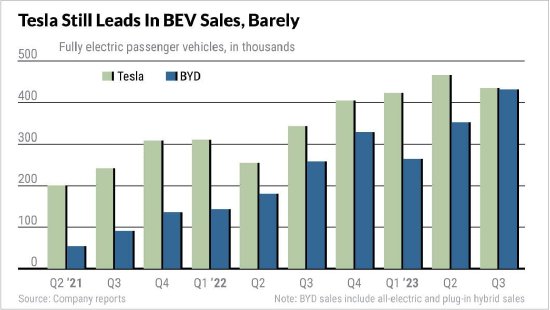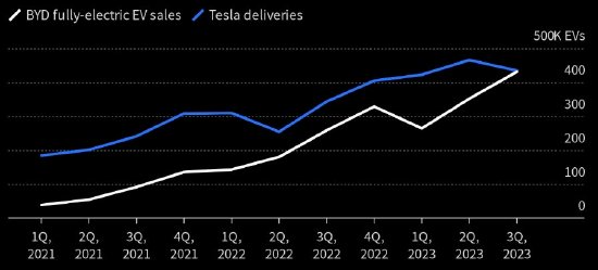 比亚迪第三季度差点取代特斯拉问鼎全球电动车销冠,这家中国汽车生产商进一步开拓新市场,而工厂停工导致特斯拉季度交付量一年多来首次下降。比亚迪第三季度纯电动车销量达到431,603辆,较第二季度增长23%。特斯拉该季度全球汽车交付量为435,059辆,两者之间的差距缩小至3,456辆,创纪录最窄。比亚迪包括混合动力车在内的汽车销量达到822,094辆,再创单季新高,巩固了其作为中国最畅销汽车品牌的领先地位。
