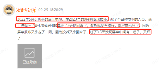在本月,有消费者向黑猫投诉平台反馈称,去年5月份购买的康佳电视机到今年9月份已经坏了三次。先是因主板损坏被技术人员带走维修,主板维修完成后被通知屏幕也损坏了,再一次送去维修,第二次维修完成收到后,过了三五天屏幕又坏了。截至9月末,康佳累计投诉1070单,回复率不足50%。