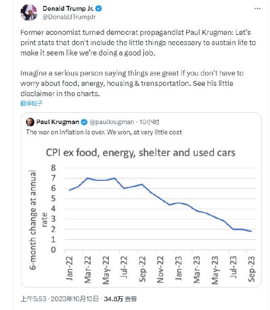 诺奖得主保罗·克鲁格曼周四在社交媒体上发帖声称,美国已赢得了抗通胀战争,而且只付出了极小的代价。这一言论遭到美国前总统特朗普的长子小唐纳德·特朗普的痛批,指责这位经济学家淡化了普通人的挣扎,并称他是“民主党宣传家”。