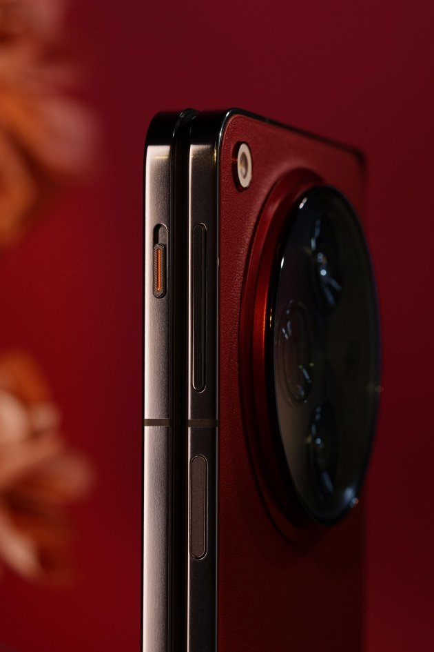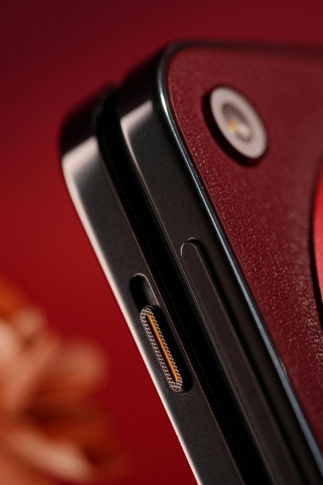荔枝纹路的素皮材质提供了很细腻的磨砂感,亮面金属边框搭配磨砂铰链中框,三段式开关以及橙色的横条标识,搭配摄像头Deco的腕表级光影效果 ,让整个手机的质感和辨识度拉满。