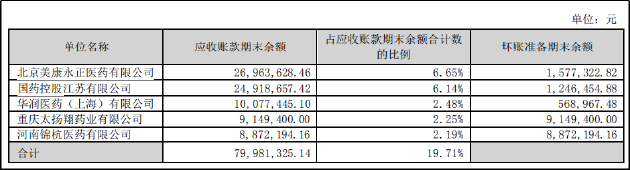 经查询,景峰医药并未对应收账款出现大额坏账的原因做出解释。半年报显示,按欠款方归集的期末余额前五名的应收账款分别来自北京美康永正医药、国药控股、华润医药等公司。天眼查显示,相关公司均为有经营实质的医药公司,出现坏账可能较小。