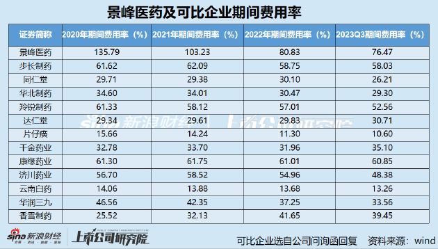 同时,公司的管理费用同样维持高位,2020-2022年以及2023年前三季度,景峰医药的管理费用占营业总收入的比例为55.81%、36.5%、24.54%、21.99%。同期公司期间费用率为135.79%、103.23%、80.83%、76.47%,远高于可比企业水平。