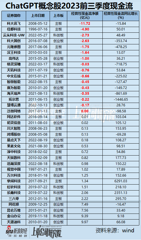 2023年前三季度,“ChatGPT概念股”中有15家公司经营性现金流为净流出状态。