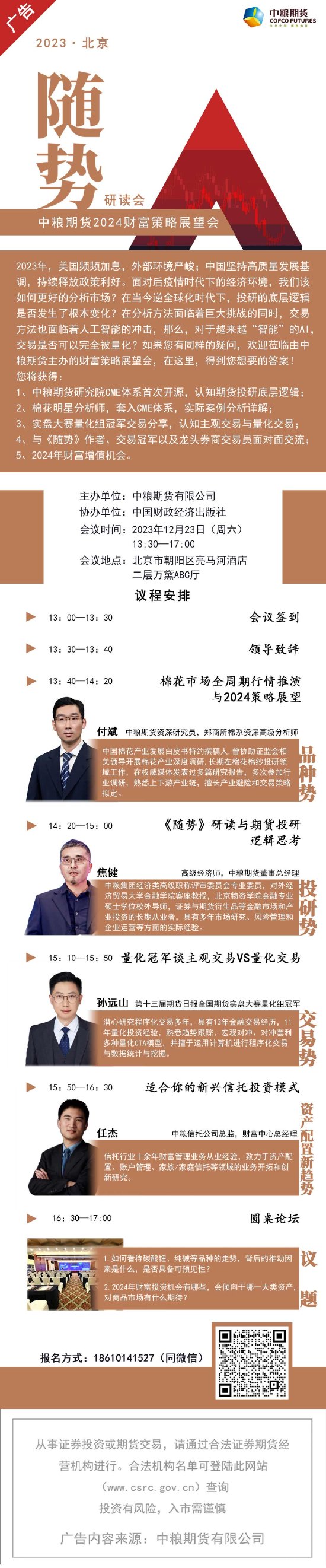 为了回馈投资者的支持,在2024年即将到来之际,我部特策划一场年终盛会,与投资者、《随势》粉丝以及期货同仁等各界人士,共同探讨2024年交易机会,跟随市场大势!会议内容: