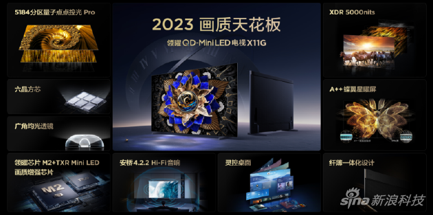 官方宣称,TCL X11G是全球第一台XDR 5000nits峰值亮度、5184分区量子点点控光Pro的“双5000”标准QD-Mini LED电视,拥有5000万:1的超高对比度,融合A++蝶翼星曜屏、4.2.2 Hi-Fi音响、领曜芯片M2+TXR Mini LED画质增强芯片、灵控桌面UI和纤薄一体化设计等配置。