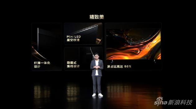 TCL X11G整机采用纤薄一体化设计,真正实现了无缝贴墙;背部采用独具特色的Mini LED星空纹理;为了解决电源线等线材杂乱问题,在底座上做了隐藏式集线设计,让桌面更加干净整洁;整机采用金属全面屏设计,屏占比高达98%,观看时屏幕无任何边框遮挡,沉浸感更强。