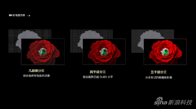 TCL认为,Mini LED作为电视显示技术的核心赛道,最大的两个特征是具有超高对比度和超高亮度,因此背光分区和峰值亮度是Mini LED的核心指标,分区数越多、它的控光就越精细、对比度越高;峰值亮度越高,细节越清晰、场景还原也就越真实。
