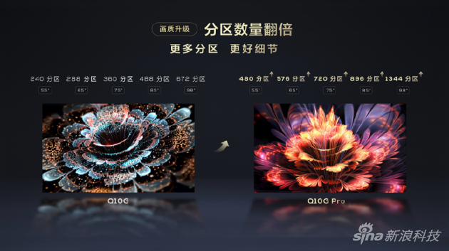全新Q10G Pro进行了五大维度的全面升级。首先是画质升级,通过全新一代Mini LED背光技术,TCL Q10G Pro实现分区数量成倍提升,98/85/75/65/55吋的分区数分别为1344/896/720/576/480,控光精细程度提升100%,可减少光晕,并且可精确调节亮度。