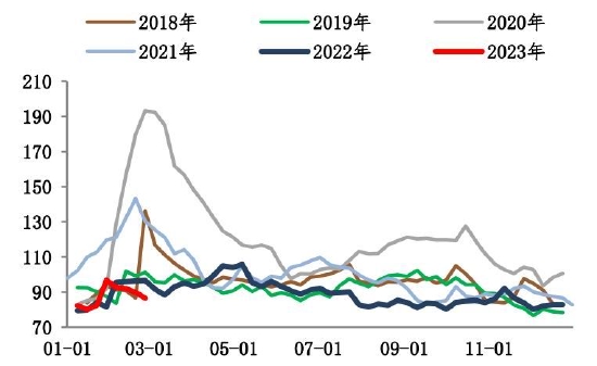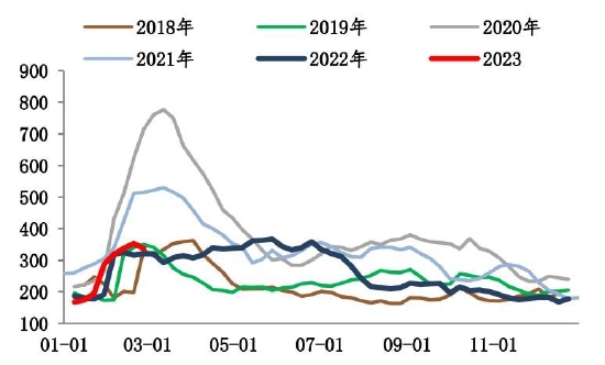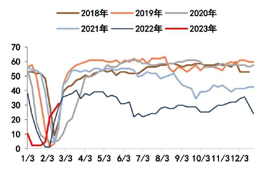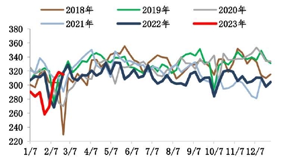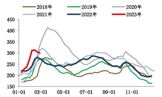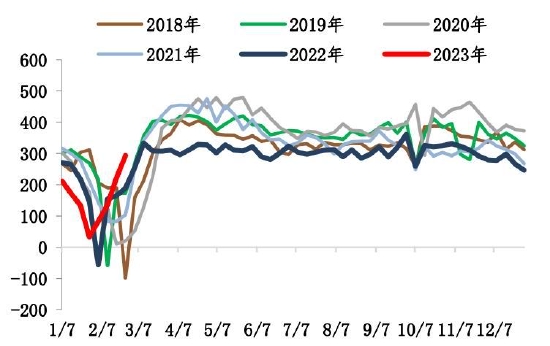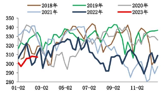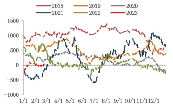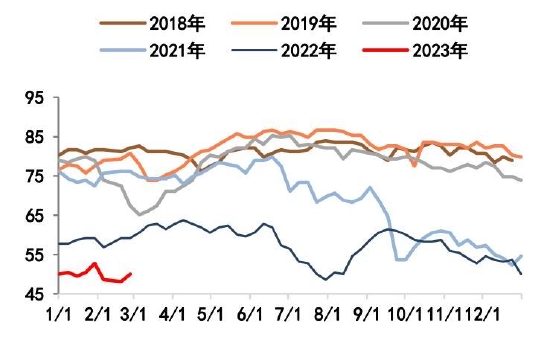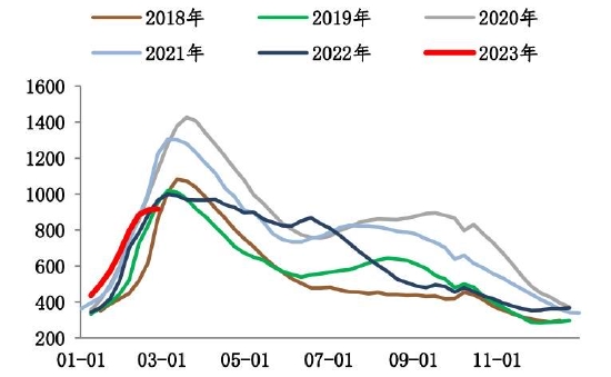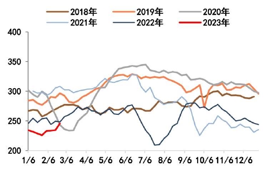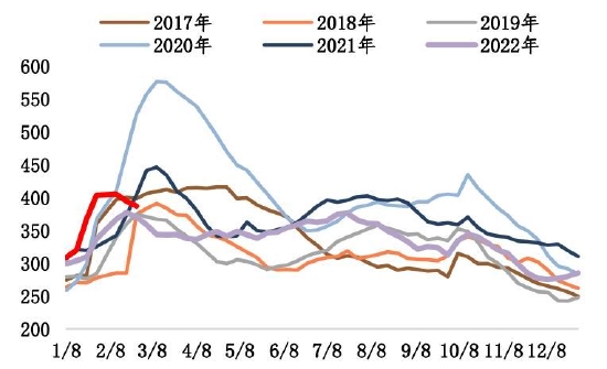 截至2月24日,螺纹钢总库存1253.24万吨,环比减少11.51万吨。2月末螺纹出现库存拐点,总库存水平低于过去6年同期水平。分环节看,本期社库915.94吨,环比垒库3.82万吨;厂库337.3万吨,环比去库15.33万吨。自元宵节过后,市场运输条件恢复,商户返市,市场交易氛围基本恢复,但因下游需求复苏比例不高,加之北方天气依旧恶劣,因此目前出库基本在于冬储订单交付以及厂库前移。