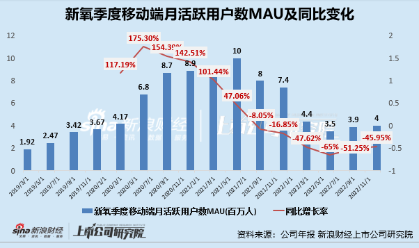 然而,从业务侧数据来看,新氧科技的核心业务运营或并不容乐观。首先,从平台用户数来看,2022年四个季度的月活跃用户规模相比2021年下了一个大的台阶。具体来看,新氧移动端第1-4季度的月活跃用户数分别为440万人、350万人、390万人、400万人,分别同比-47.62%、-65% 、-51.25%、-45.95% ,降幅均超过了45%,近乎腰斩。