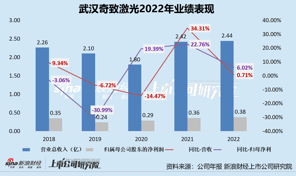 首先,从医美器械布局角度看,2021年7月,新氧以7.91亿元收购武汉奇致激光84.49%的股份,借此成功进军医美器械领域。近日,奇致激光发布了业绩快报,2022年公司营收为2.44亿元,仅较2021年增长了200万,同比微增0.71%;公司归母净利润为0.38亿元,较去年增长200万,同比增长6.02%。武汉奇致激光不温不火的业绩表现,或很难弥补新氧科技资讯服务营收下滑的漏洞。