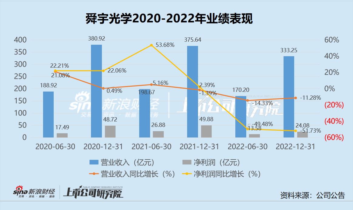 近日,舜宇光学发布了2022年全年业绩,公司2022年实现营业总收入为333.25亿元,相比去年同期的375.64亿元,同比减少11.28%;实现净利润为24.08亿元,而去年同期为49.88亿元,净利润腰斩超50%。