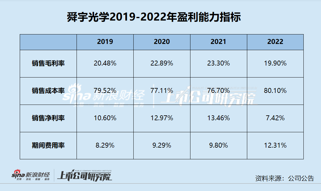 直接导致舜宇光学净利润腰斩的,不仅是逐渐规模缩减的净利润,还有公司未能跟上的成本控制。从销售毛利率来看,2019-2021年,舜宇光学的毛利率有所上升,分别为20.48%、22.89%与23.30%,但2022年突然降至19.90%,下降近4个百分点,对利润带来一定负面影响。与此同时,期间费用也未能同步减少。2019-2022年,舜宇光学的期间费用率分别为8.29%、9.29%、9.80%与12.31%,2022年相比以前年度突然增加,进一步对利润造成蚕食。2022年,舜宇光学的净利率仅为7.42%,与往年超10%的净利率相比近乎减少一半。