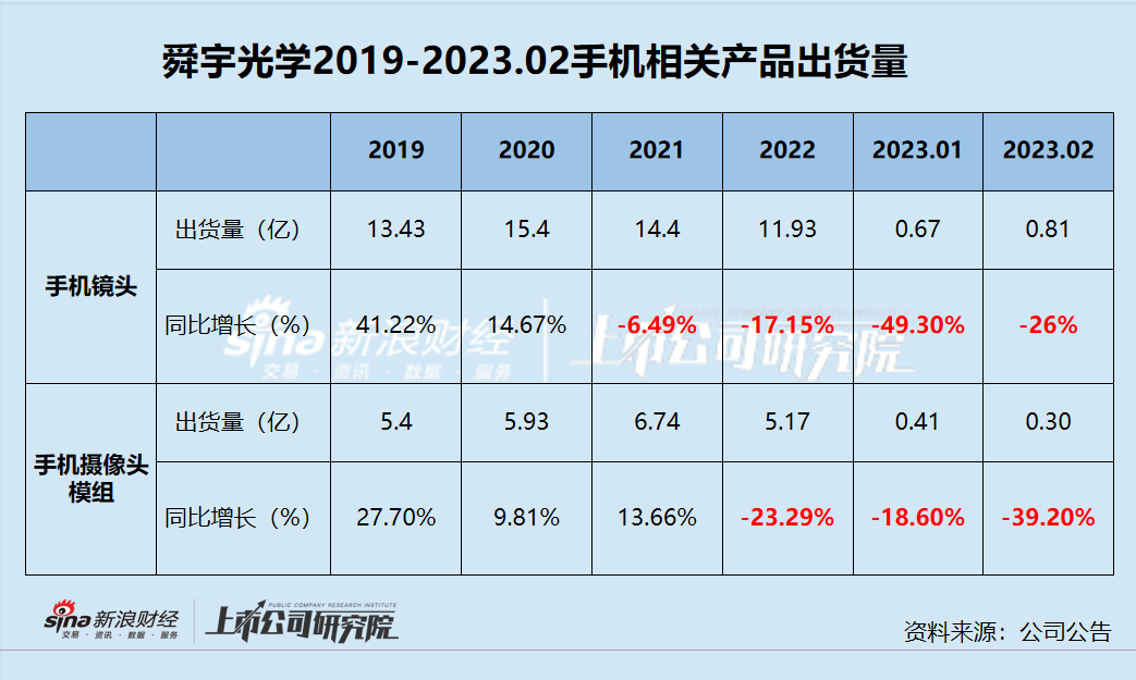 而到了2023年,出货量下滑的情况仍在继续,甚至有进一步加深的趋势。2023年1-2月,手机镜头的出货量分别为0.67亿与0.81亿,同比减少49.30%与26%;手机摄像头模组的出货量分别为0.41亿与0.30亿,同比减少18.60%与39.20%。舜宇光学在2023年的业绩表现或依然要被智能手机市场的疲软所拖累。