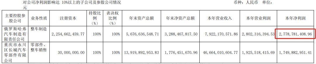 年报显示,长城汽车子公司“俄罗斯哈弗汽车制造有限责任公司”,全年实现营收79.22亿元,净利润高达27.79亿元,扣除汇兑收益、政府补助后的净利润则为5.59 亿元。受此影响,长城汽车财务费用从2021年的-4.48亿元,大幅减少至2022年的-24.88亿元。