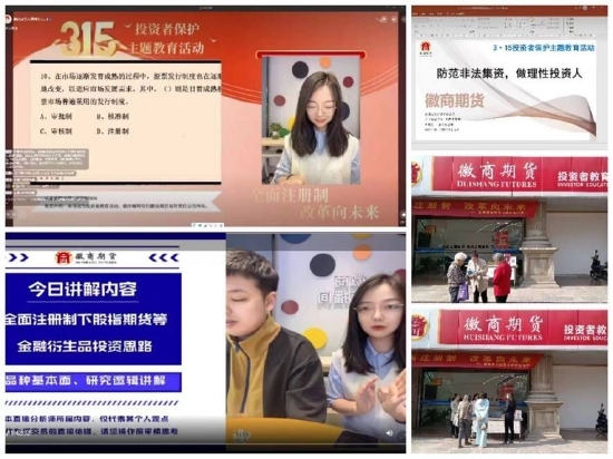 在线上,徽商期货投教基地先后开展了“全面注册制宣传解读”“防范非法证券期货活动及案例解读”活动;“全面注册制下股指期货等金融衍生品投资思路”线上直播答疑活动;“3•15投资者保护主题教育”有奖答题直播活动;期货夜校之“期权交易与实战”3•15专场培训等。活动环节投资者踊跃参与,积极答题,极大的提升了投资者学习热情和参与度,娱乐学习两不误。