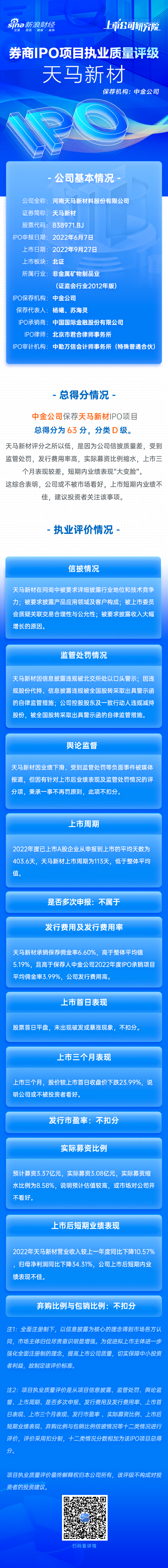 天马新材IPO项目总得分为63分,分类D级。天马新材评分之所以低,是因为公司信披质量差,受到监管处罚,发行费用率高,实际募资比例缩水,上市三个月表现较差,短期内业绩表现“大变脸”。这综合表明,公司或不被市场看好,上市短期内业绩不佳,建议投资者关注该事项。