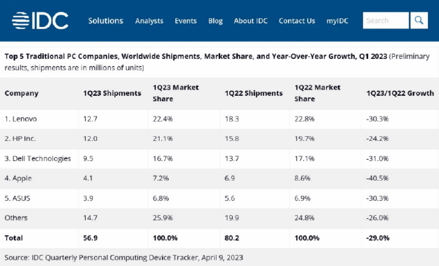 日前,IDC发布了全球PC市场数据报告,数据显示今年第一季度全球PC出货量为5690万台,较去年同期的8020万台下滑了29%,甚至已低于2019年同期水平,2019年一季度,全球PC出货量为6060万台。