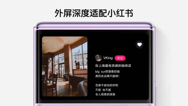 vivo X Flip配备3.0英寸行业最大横向外屏,不仅可实现自定义的百变壁纸,还入驻了6只电子萌宠,无论刷微博、抖音、小红书,还是看剧、追番、听音乐,外屏快捷交互都不在话下,更能为用户的出行、支付等生活场景提供快捷服务。