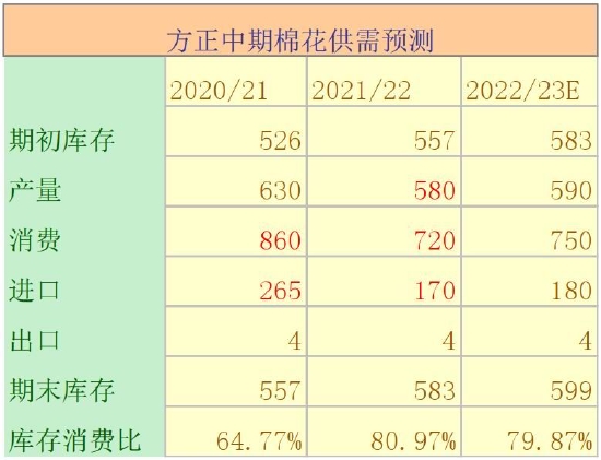 表4:方正中期2020/21年度棉花供需预测