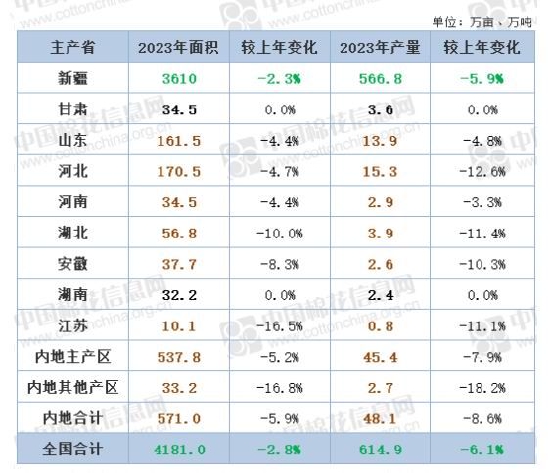 据中国棉花信息网对于新年度种植面积意向的调查,新疆棉花2023年意向播种面积达4181万亩,同比减少降幅2.8%。全国棉花总产预计614.9万吨,较去年减少39.7万亩。内地种植面积减少571万亩,较去年减少36万亩,减幅5.9%。