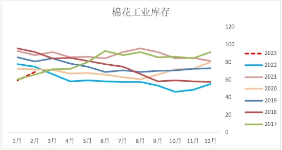 2月,棉纺织企业棉花工业库存延续增长态势。据调查,截至2月底纺织企业在库棉花工业库存量为68.62万吨,较前月底增加9.3万吨。纺织企业可支配棉花库存量为111.26万吨,较前月底增加11.92万吨。3月棉花价格高位回落,纺企为即将到来的“金三银四”传统旺季进行季节性适量补库,原料库存有所增加,但由于疆棉禁令影响之下出口后市存疑,总体补库仍较为谨慎,以逢低采购为主。