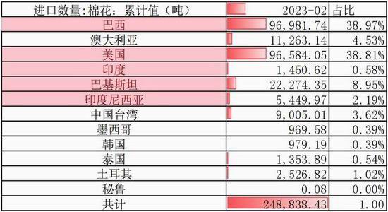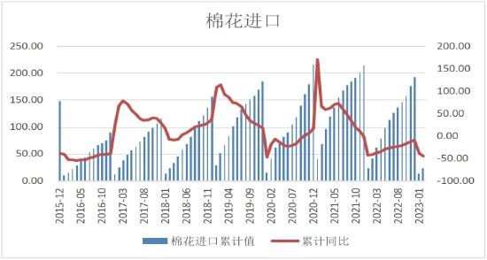 2023年1-2月我国进口棉花约23万吨,同比下降约45.5%。