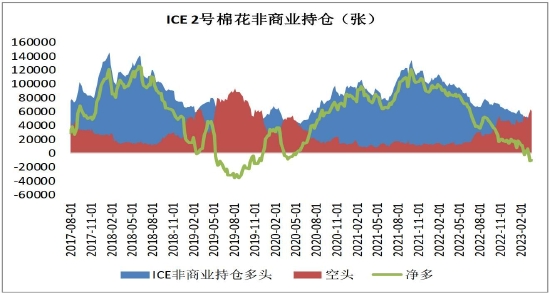 CFTC持仓情况:截止至2023年3月28日当周,ICE棉花非商业多头为50893张,空头为61014张,净持仓为-10121张;