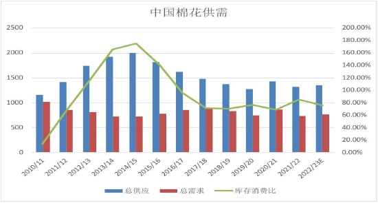 中国棉花总体仍处于供大于求格局,总供应维持在1200万吨,需求预计维持低位,消费在新年度可能将略好于21/22年度。库存消费比维持在80%附近,近年来国内总体处于去库存周期,库存消费比总体趋势处于下行通道。