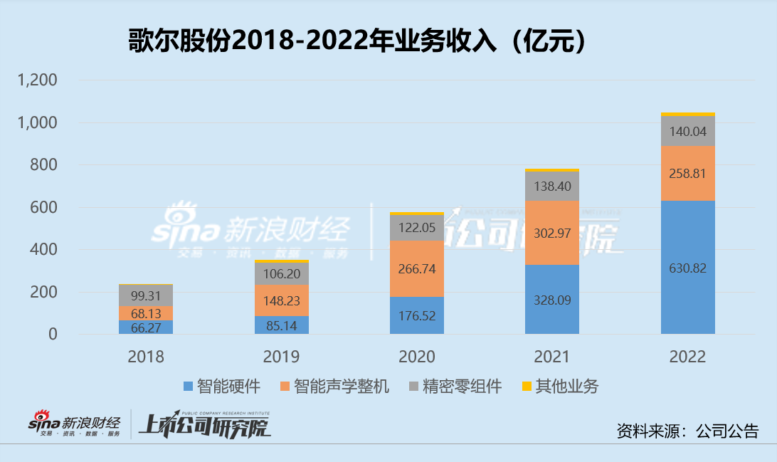 一季报中,歌尔股份没有披露不同业务的具体收入规模与占比,但结合砍单结果以及近年来业务发展趋势来看,智能硬件业务或仍为营收主力,而智能声学整机与精密零组件等其他业务则占比将对较小。