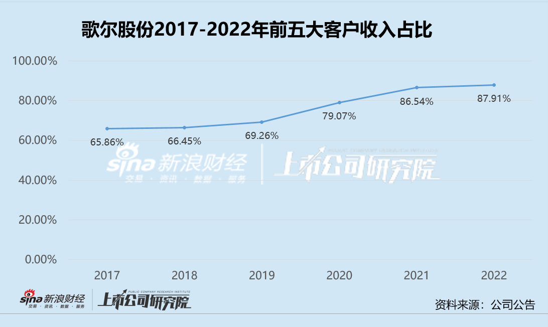 2017-2022年间,歌尔股份来自前五大客户的销售收入占比分别为65.86%、66.45%、69.26%、79.07%、86.54%与87.91%,收入占比连年走高。