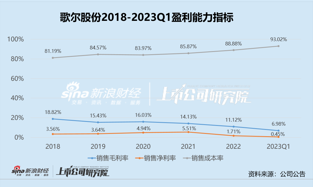 由此来看,即便是以VR/AR等智能硬件为业务重心之后,歌尔股份的业绩不但没有出现正向的增长,却反倒被拖累。2023年一季度,歌尔股份的销售毛利率与净利率均来到了历史最低点,盈利能力堪忧。