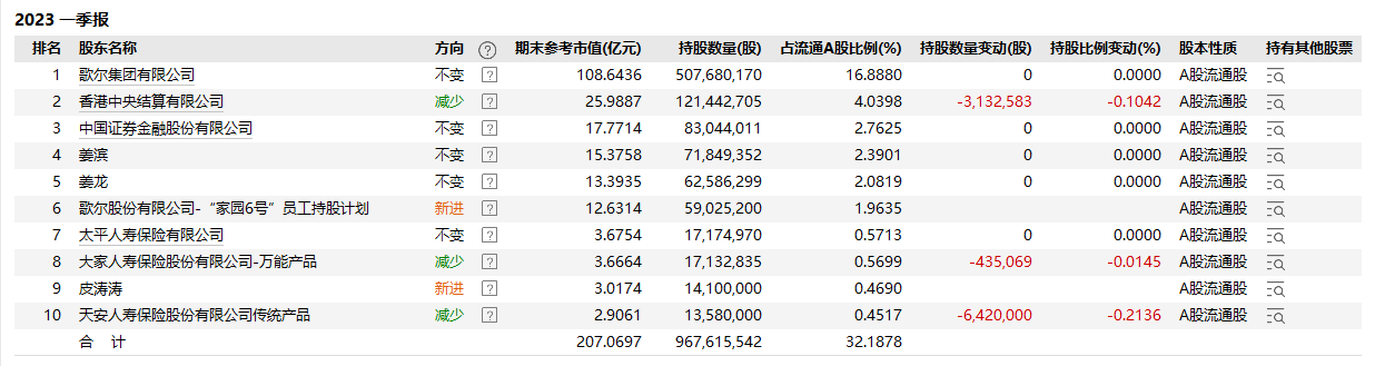 但2022年以来,机构投资者对于歌尔股份却是不断减持,甚至清仓离场。截至2023年一季度,曾经重仓歌尔股份的机构投资者几乎均以消失在了前十大流通股东行列。当前基金的持股比例仅为1.45%,券商持股比例为0,仅有保险资金入场持股比例为1.59%,陆股通持股比例为4.04%。