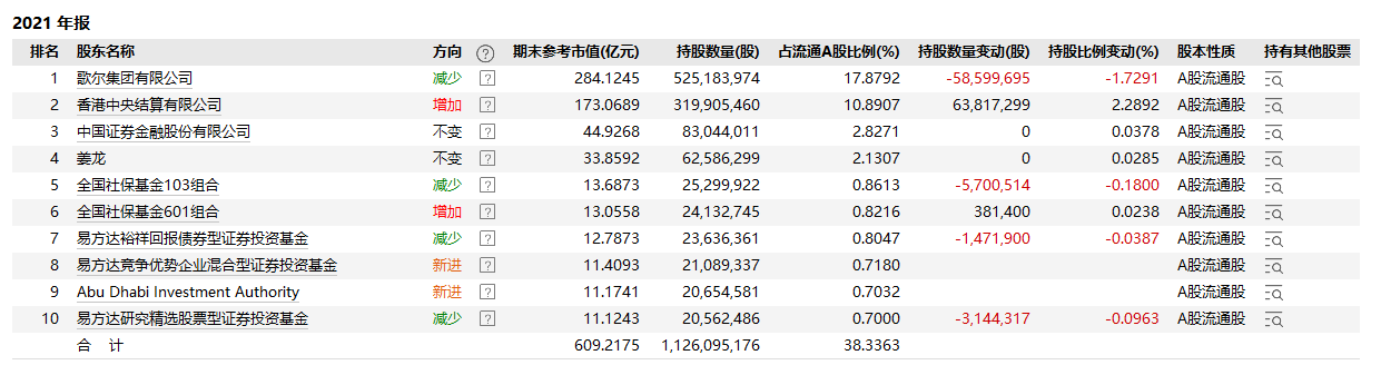 在之前的几年中,歌尔股份曾是基金、券商、外资、保险等机构投资者的重仓股。2021年底时,易方达、社保基金组合、中国证券金融公司、阿布扎比投资局等机构都均为歌尔股份的前十大流通股东。彼时歌尔股份来自基金的持股比例曾高达20.16%,券商持股比例为0.72%,陆股通持股比例为10.89%。