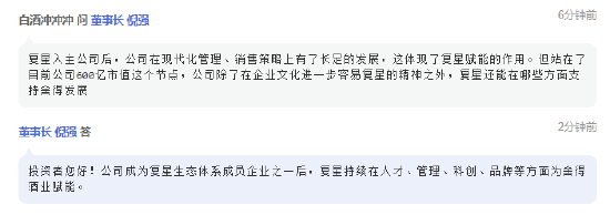 会上,有投资者对董事长倪强提问称,复星入主公司后,公司在现代化管理、销售策略上有了长足的发展,这体现了复星赋能的作用。但站在了目前公司600亿市值这个节点,公司除了在企业文化进一步容易复星的精神之外,复星还能在哪些方面支持舍得发展?
