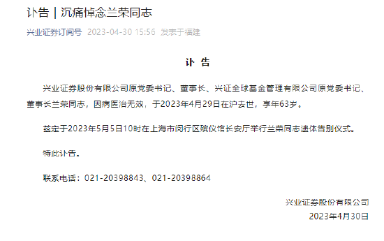 兴业证券股份有限公司今天下午发布讣告,原党委书记、董事长、兴证全球基金管理有限公司原党委书记、董事长兰荣同志,因病医治无效,于2023年4月29日在沪去世,享年63岁兹定于2023年5月5日10时在上海市岗行区殡仪馆长安厅举行兰荣同志遗体告别仪式。