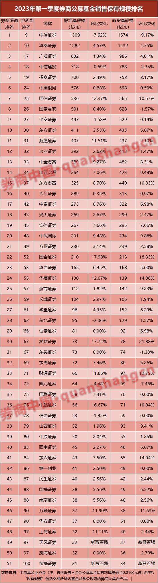 从券商渠道来看,51家券商合计股混基保有规模达12854亿元,非货基保有规模14618亿元,分别环比增长2.26%、1.67%,约七成券商保有规模环比增长。不过,券商渠道的市占率小幅下滑。从具体券商来看,中信证券股混规模环比下降7.62%,最新规模达1309亿元;国信证券股混类基金保有规模在一季度大增12.37%,增幅在前十中最高。