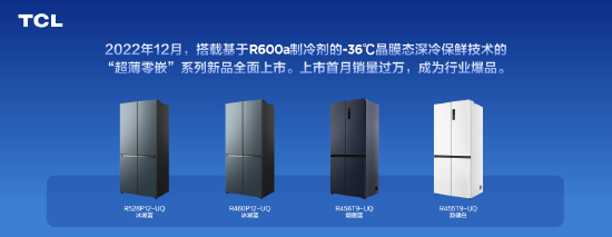 TCL从2021年初启动了基于R600a制冷剂的超低温技术研究,并在2022年10月实现重大突破,达成基于R600a制冷剂的-36℃晶膜态深冷保鲜技术,形成了TCL-36℃深冷核心技术。这项技术可以通过在食物表层快速生成冰晶带,并持续保持深冷低温,将食材精华牢牢锁住。2022年12月,搭载该技术的“薄嵌”系列新品全面上市。上市首月销量过万,成为行业爆品。