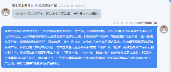 对此,北京燕京啤酒总经理谢广军回复称,公司深刻洞察消费需求,在产品上不断推陈出新,2022年度公司中高端产品收入占比60%以上。公司完成多款燕京主品牌战略单品研发上市,打造燕京V10白啤、高端拉格S12皮尔森,统一集团单品形象,重塑焕新鲜啤2022、雪鹿啤酒,推出U8plus、老燕京12度特满足细分需求,推出狮王精酿高端品牌系列产品,多款已进入市场转化流程,与中国酒业行业协会联名完成“观渺”和“隋源”两款超高端产品研发和定制生产,燕京高端化产品矩阵更加完善,“研发一批、上市一批、储备一批”的创新模式更加成熟。2022年总部精酿中心竣工投产,标志着北京、广西两大精酿啤酒生产基地布局构成,成为高端品牌与产品快速孵化的生产基地,将持续提供高品质特色产品输出。