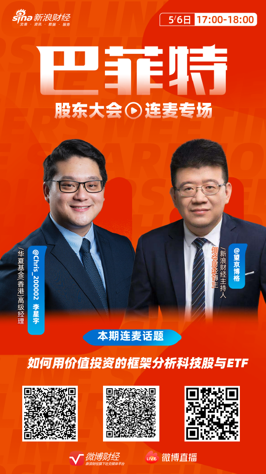 5月6日消息,巴菲特股东大会之际,华夏基金(香港)高级经理李星宇,主持人望京博格,连麦直播分享《如何用价值投资的框架分析科技股与ETF》查看链接>>。