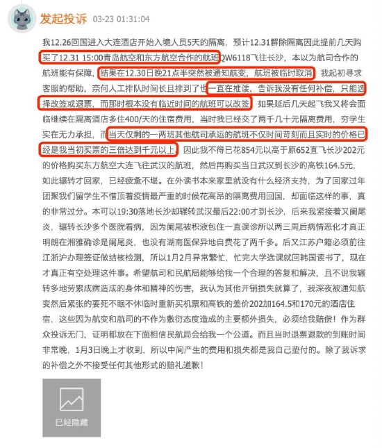 近日,有消费者通过黑猫投诉【投诉入口】平台反馈,自己购买青岛航空的合作航班机票,结果在起飞前一天晚上突然收到航班临时取消的通知,联系客服被告知没有任何补偿,只能选择改签或退票,但当时无任何临近时间的航班可供改签,而当天仅剩的一两班其他航司的航班不仅时间苛刻且实时价格已是购票时的三倍达千元以上。