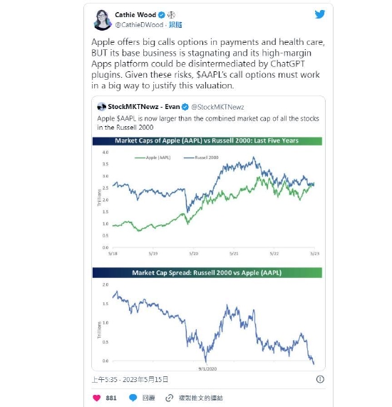 她写道:“苹果在支付和医疗保健领域提供大量看涨期权,但其基础业务停滞不前,其高利润的APP平台可能会被ChatGPT插件去中介化。考虑到这些风险,苹果的看涨期权必须在很大程度上发挥作用,以证明其估值是合理的。”