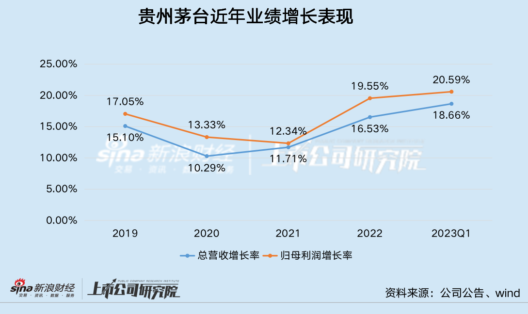 2022年,贵州茅台实现营业总收入1276亿元,同比增长16.5%,归母净利润627亿元,同比增长19.6%,增速均为近几年来新高水平。2023年,茅台1季度实现总营收393.79亿元,同比增长18.7%,实现归母净利润207.95亿元,同比增长20.6%,增速持续稳中有升。