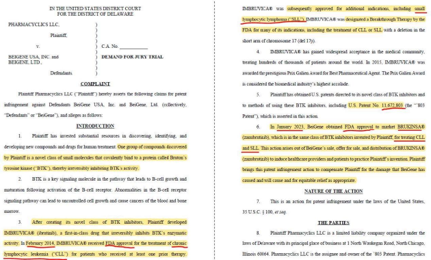 在诉讼文书中,Pharmacyclics表示其已获得针对新型BTK抑制剂类别,以及使用相关BTK抑制剂的方法(治疗个体慢性淋巴细胞白血病CLL或小淋巴细胞淋巴瘤SLL)的专利。而百济神州的泽布替尼拥有专利中的限定结构,且获批上市的使用方法与获得专利的使用方法一致,因此Pharmacyclics认为百济神州构成侵权。
