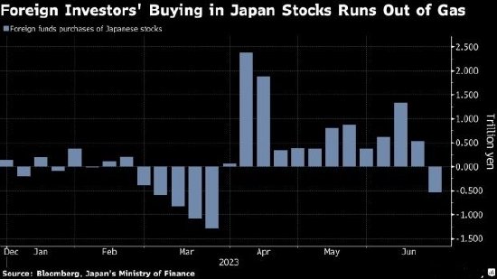 自3月底以来,海外投资者每周都是日本股票的净买家,累计买入了9.9万亿日元的股票。但最新数据表明,在连续12周的净买入推动日本股市升至33年高点之后,外国投资者对日本股票的兴趣可能正在减弱。